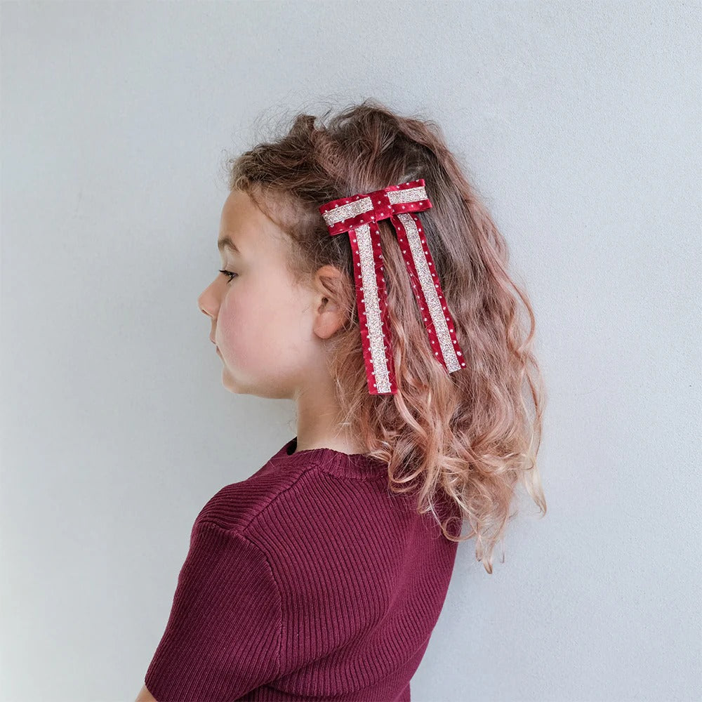 Mimi & Lula Circus Glitter Bow Toka - Red, derin kırmızı kadife ve altın simle hazırlanmış sirk temalı gösterişli bir fiyonk. Uzun kuyruklu bu toka, at kuyruğu ya da yarım toplu saç modelleri için mükemmel bir seçimdir.