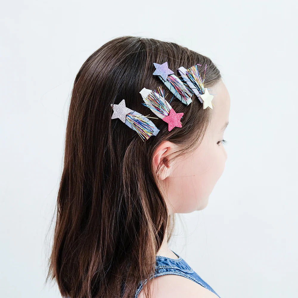 Mimi & Lula Tinsel Star 4'lü Toka, renkli tinsel kuyruklarıyla saçlara parlak ve neşeli bir dokunuş katıyor. Parti günleri veya oyun buluşmaları için mükemmel olan bu tokalar, her günü daha da ışıltılı hale getirir.