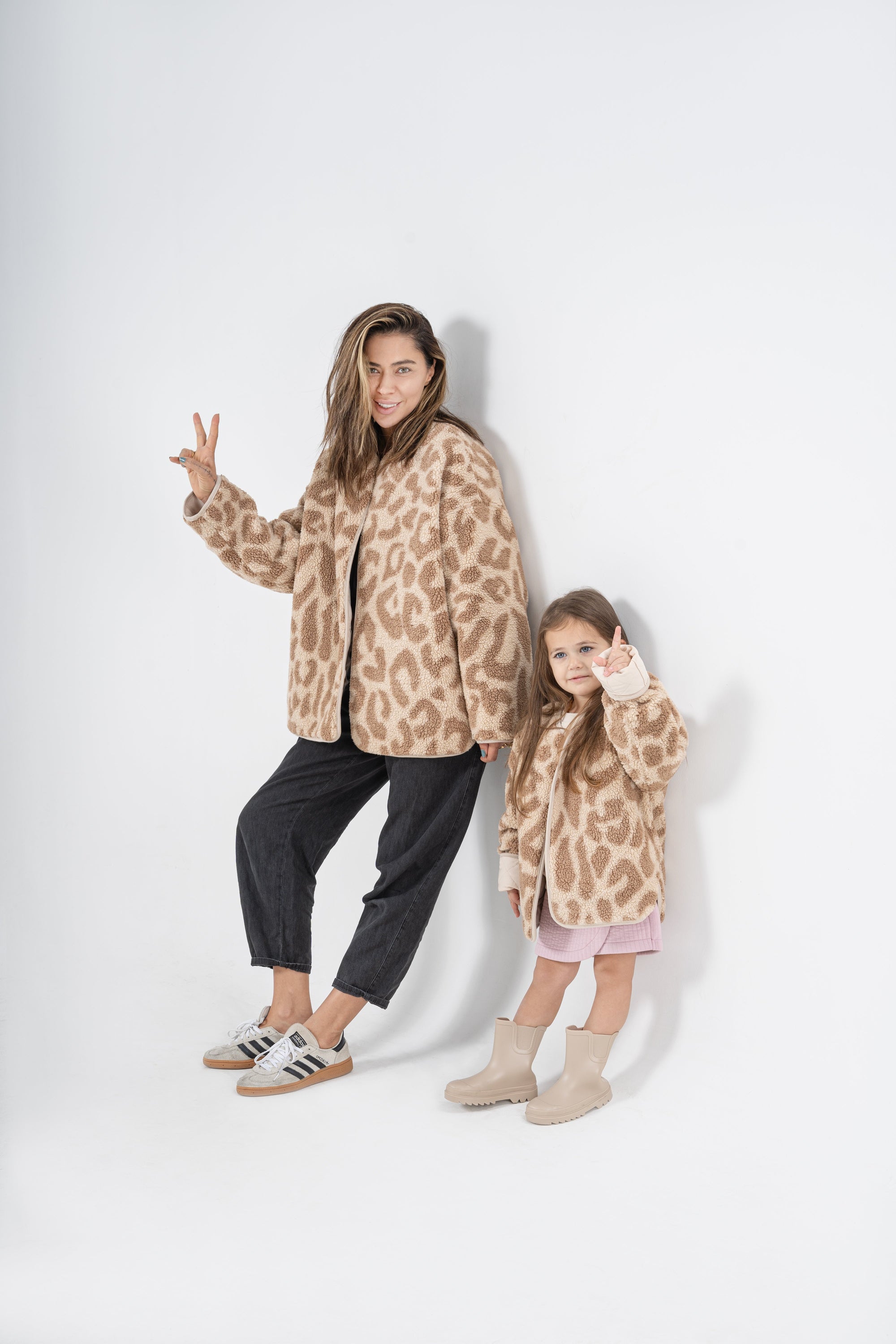 Metal çıtçıtları sayesinde kolayca giyilip çıkarılan bu oversize ceket, arkasında yer alan eğlenceli leopar figürlü etiketiyle çocuklar için eğlenceli, yetişkinler için ise stil sahibi bir detay sunuyor.