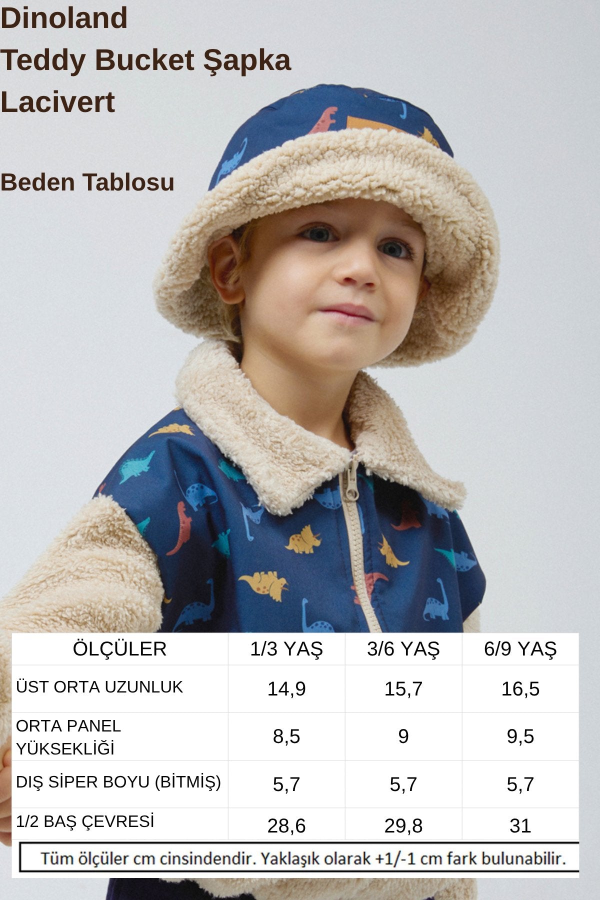 Minik kaşiflerin vazgeçilmezi: Dinoland Teddy Bucket Şapka! Lacivert rengiyle modern ve şık bir duruş sunarken, teddy kumaşın yumuşacık dokusuyla sıcacık bir konfor sağlar. Üzerindeki sevimli dinozor detayları ise çocukların hayal dünyasını renklendirir, bu şapkayı eğlenceli bir günlük aksesuar haline getirir.