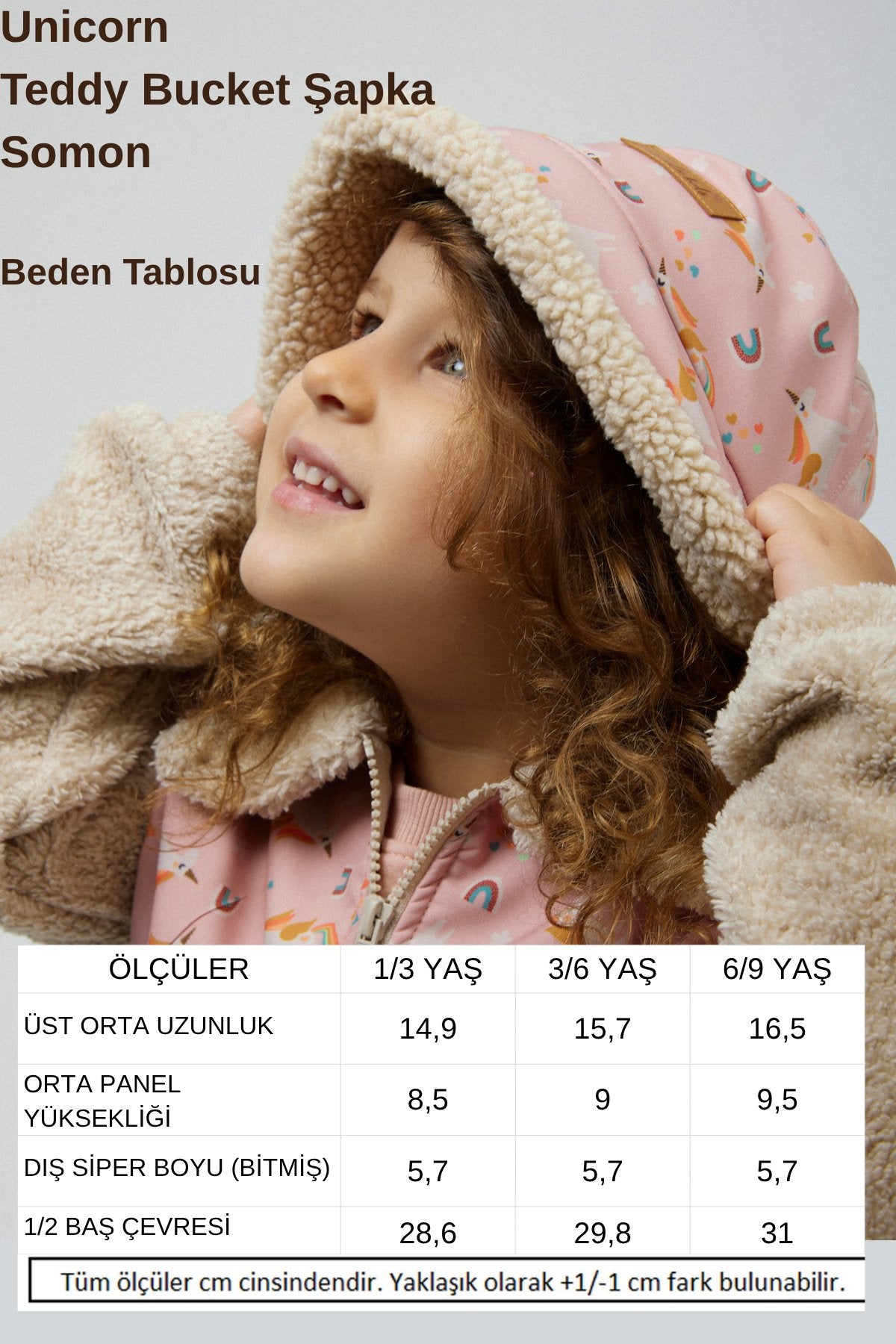 Miniklerin stiline eğlenceli ve şirin bir dokunuş: Unicorn Teddy Bucket Şapka! Somon rengiyle yumuşak ve canlı bir görünüm sunarken, teddy kumaş dokusu sayesinde hem konforlu hem de sevimli bir aksesuar haline gelir. Unicorn detayları ise çocukların hayal gücüne eşlik ederek bu şapkayı favori parçaları yapar.
