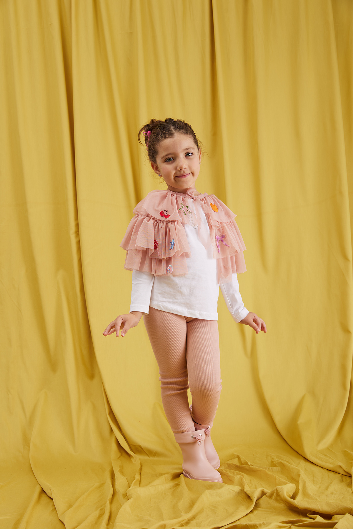 Hem pelerin hem de etek olarak kullanılabilen bu çok yönlü tasarım, miniklerin hayal dünyasını renklendirmek için hazır! Somon tonundaki likra tül dokusu, hafif ve akışkan yapısıyla her kombine zarif bir dokunuş ekler. Üzerindeki çocukların çok sevdiği trend figür nakışları ise ürünü sıradan bir aksesuardan çıkarıp keyifli bir stil parçasına dönüştürür.